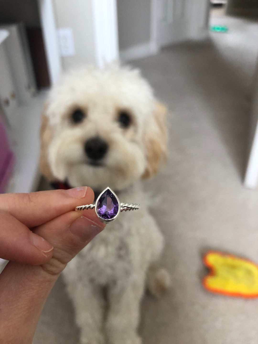 Her dog, Kona, is a great studio buddy. Kona loves to wander into the studio, check out all the finished jewelry pieces & have snuggle breaks thought the day.